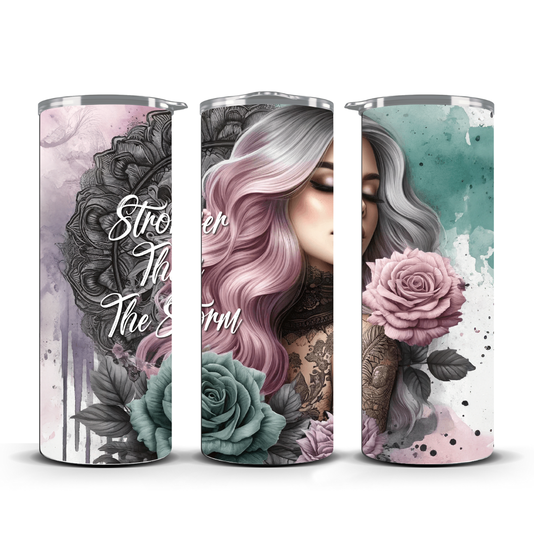 Stay hydrated in style with our STRONGER THAN THE STORM TUMBLER! This 20oz stainless steel powerhouse isn't just a pretty face – it's your drink's new best friend. Sip hot coffee for up to 6 hours or enjoy ice-cold refreshments for 8 hours through the included straw. With its resealable lid, you can conquer any adventure without spills. Weather the day, one sip at a time!