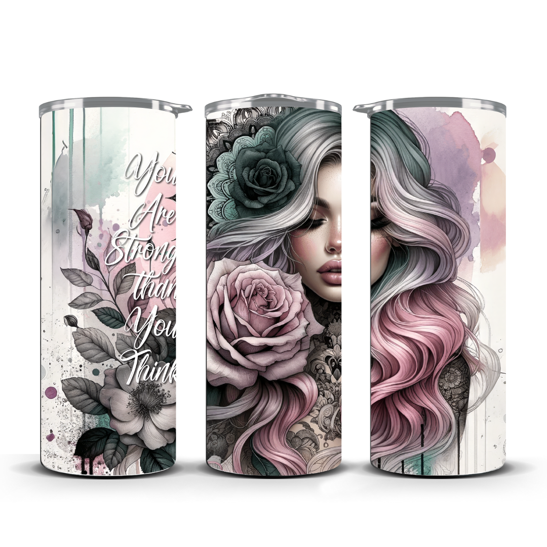 Stay hydrated in style with our "YOU ARE STRONGER THAN YOU THINK" tumbler! This 20oz stainless steel powerhouse keeps your morning coffee steaming for 6 hours or your afternoon refreshments icy for 8 hours. Complete with a resealable lid and straw, it's ready to accompany you through tough workouts, challenging meetings, or whatever life throws your way—just like you, it's tougher than it looks!